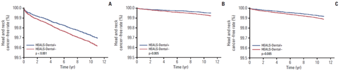 ▲[그래프] 구강검진을 받은 그룹(파란색)과 받지 않은 그룹(붉은색)에서 두경부암이 아닌 환자 비율. 붉은색 선이 파란색에 비해 시간이 지날수록 빠르게 하락한다.(왼쪽 그래프부터 두경부암(A), 구인두암(B), 구강암(C)) |