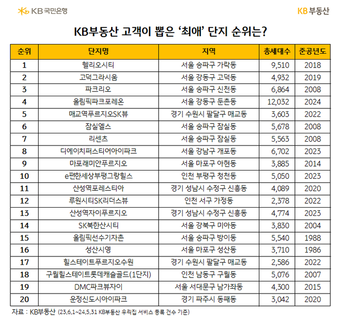 KB부동산이 이번에 발표한 ‘최애’ 단지 순위는 지난해 5월말 이후 1년간 전국 아파트 단지 중 고객이 직접 등록한 우리집 건수가 가장 많은 20곳을 선정한 것이다.