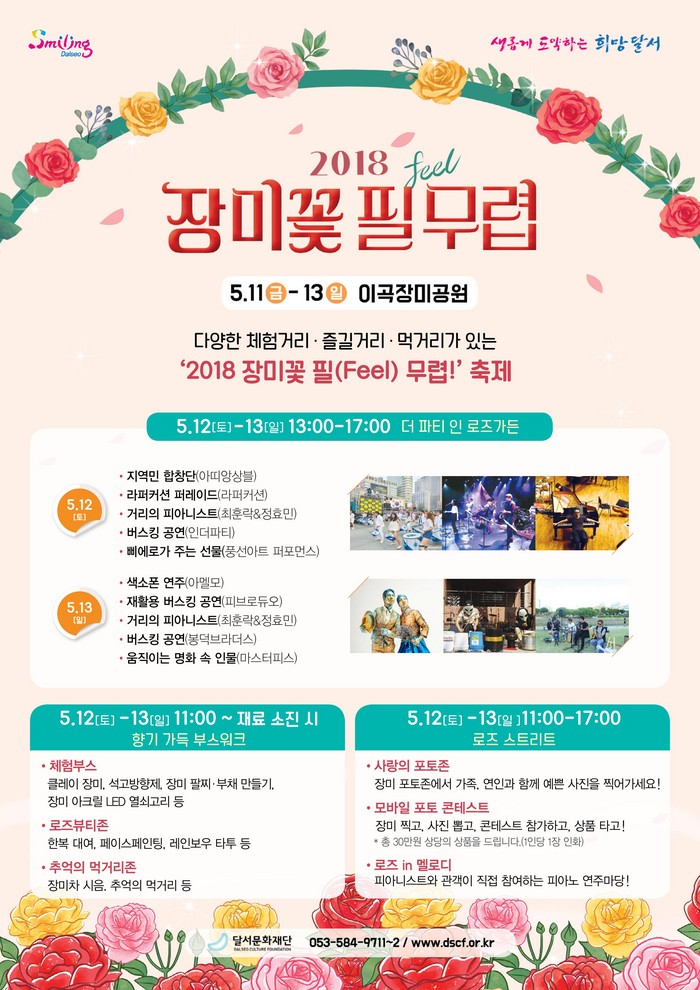 이태훈 달서구청장은 “120여종의 장미 1만7000여 그루가 있는 이곡장미공원은 대구 유일의 도심 장미정원으로 장미꽃 개화시즌과 함께 방문객들의 발길이 가득한 지역명소인 만큼 ‘2018 장미꽃 필(Feel) 무렵’에서 사랑하는 사람들과 함께 눈부신 계절, 아름답게 피어나는 장미를 즐기길 바란다”고 전했다.