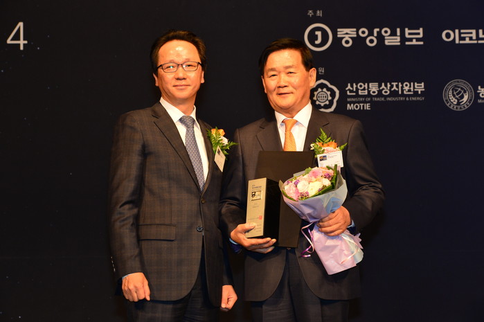 ▲박우정 고창군수(오른쪽)가 4일 서울 소공동 롯데호텔 크리스탈 볼룸에서 ‘2016 국가브랜드 대상’을 수상하고 있다. |
