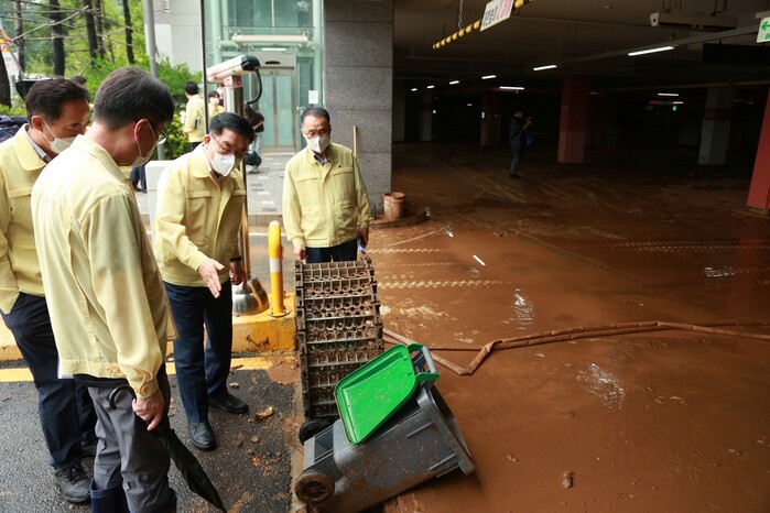 ▲연일 집중호우 침수피해 현장을 방문한 문헌일 구로구청장(항동 지하주차장 일대). 구로구 제공 |