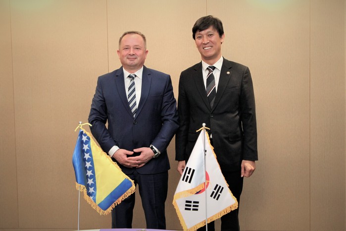 | ▲김영문 관세청장이 19일 무역원활화 세미나에 참석한 보스니아 고위급인사와 양자면담후 기념촬영을 하고 있다.(관세청 제공) |