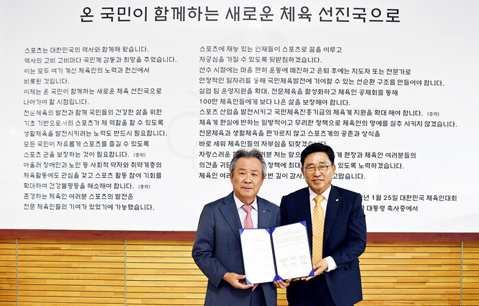 ▲한국농수산식품유통공사-대한체육회 MOU 기념사진. 한국농수산식품유통공사 김춘진 사장(오른쪽), 대한체육회 이기흥 회장(왼쪽) |