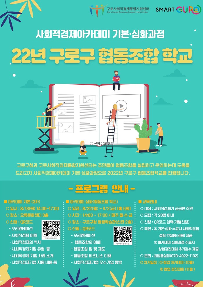 심화과정은 협동조합의 역사와 특성, 관련법, 비즈니스의 이해 등으로 구성돼 22일부터 내달 2일까지 월·수·금 오후 2시에 구로구청 평생학습관에서 진행된다.