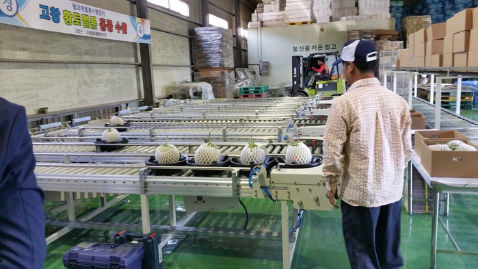 ▲고창 황토멜론을 재배하는 농민이 홍콩으로 수출하는 멜론을 선별하고 있다. |