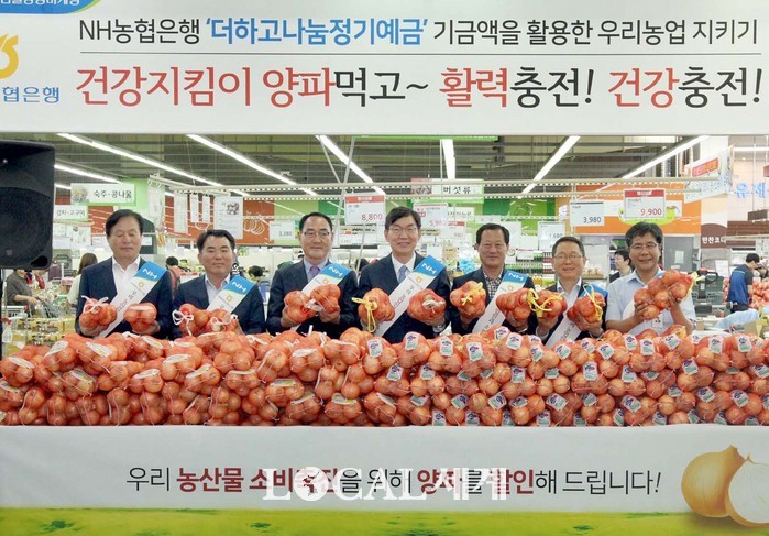 21일 하나로마트 양재점에서 진행한 ‘양파 농가 지원을 위한 행사’에서 이대훈 NH농협은행장(왼쪽에서 네 번째) 농협경제지주 김원석 대표이사(오른쪽에서 두 번째) 이수현 농협유통 대표(오른쪽) 등 참석자들이 양파를 들고 농산물 상생 마케팅 행사를 진행하고 있다.