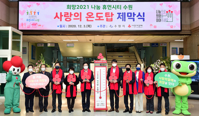 수원시는 3일 오후 1시20분 시청 본관 로비에서 ‘사랑의 온도탑’ 제막식을 열고, 앞으로 2개월간 진행될 ‘희망 2021 나눔 캠페인’의 시작을 알렸다.