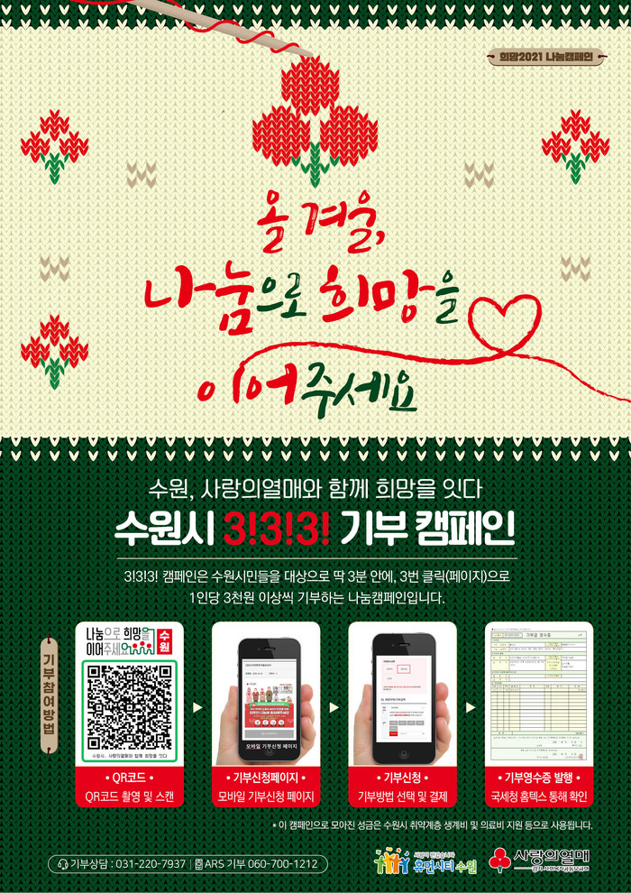 올해는 비대면 방식의 모바일 기부 캠페인도 병행한다. 수원시는 ‘수원시 3! 3! 3! 모바일 기부 캠페인’을 마련해 시민 누구나 큐알(QR)코드를 스캔해 3분 안에, 3번 클릭으로(페이지), 3천 원씩을 기부하는 방식으로 기부에 참여할 수 있다.