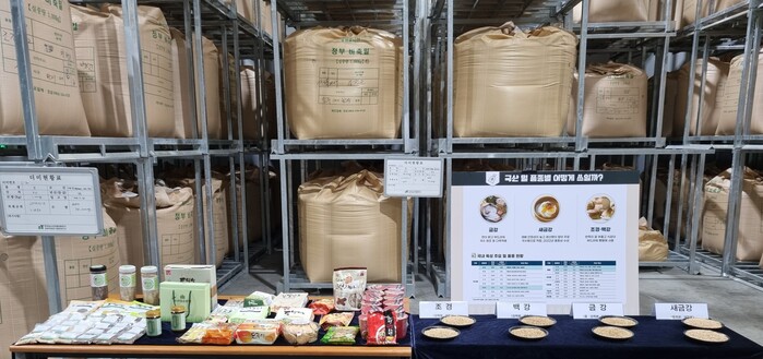 ▲ 국산밀 비축 현장 전경과 국산밀 제품 샘플 전시. aT 제공 |