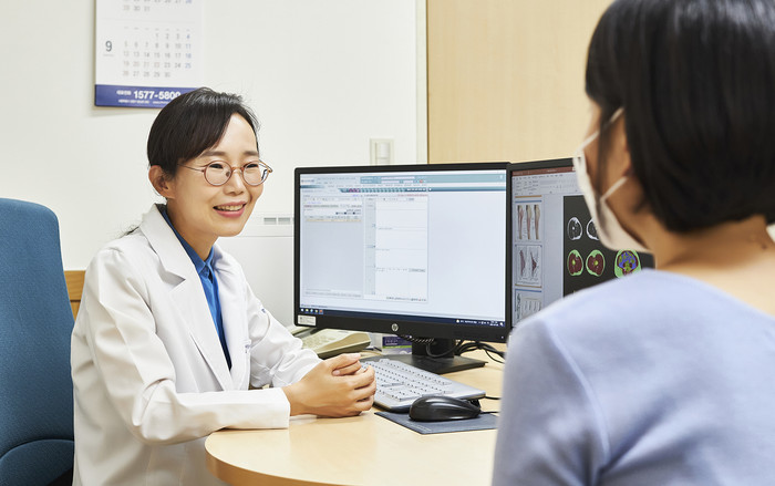 ▲강동경희대학교병원 한방재활의학과 송미연 교수가 한 환자와 진료상담하고 있다. |