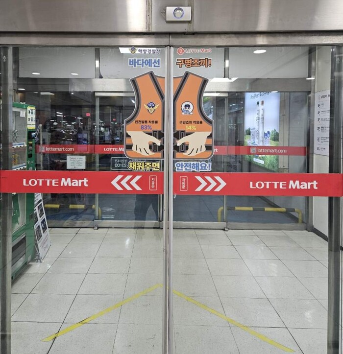 ▲롯데마트 자동문에 부착된 구명조끼 착용 생활화 캠페인, 남해해양경찰청 제공 |