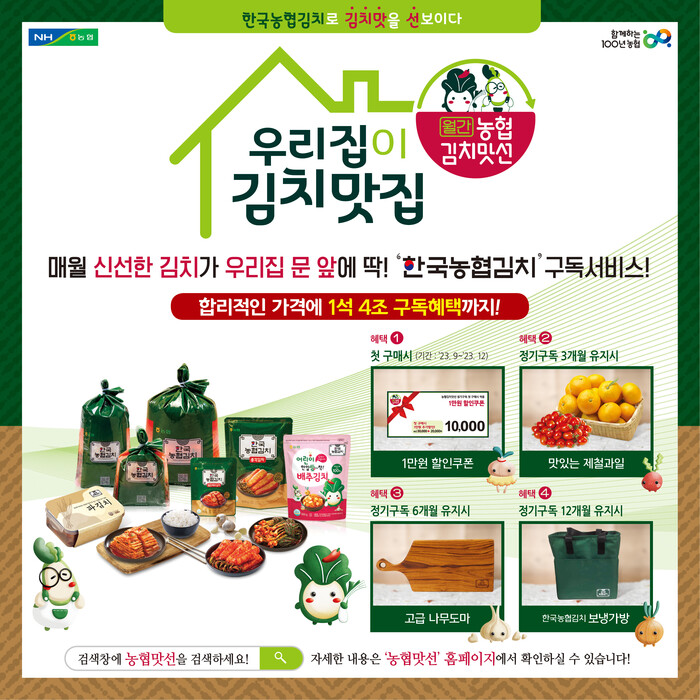 농협김치맛선 구독 시 시중 김치 정상가격 대비 평균 30% 이상 저렴한 가격으로 상품을 구입할 수 있으며, 구독상품 중 ‘시그니처’ 세트와 ‘취향저격’ 상품을 구독하는 회원(2023년 內 정기구독 신청 회원, 선착순 1만 명)을 대상으로 ▲첫 구매 시 1만원 할인 ▲정기구독 3개월 유지 시 맛있는 제철과일 ▲6개월 유지 시 고급 나무 도마 ▲12개월 유지 시 보냉가방 증정 등 다양한 구독 혜택을 제공한다. 정기구독 외에 선물세트 상시 구매도 가능하며, 상품 구매와 혜택에 대한 자세한 내용은 ‘농협맛선’ 홈페이지에서 확인할 수 있다.