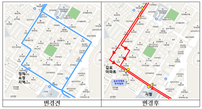 시는 이런 불편을 해소하기 위해 운행해야 하는 경로 상의 불법주정차를 근절하고 지역 주민의 적극 협조로 버스통행이 가능하도록 여건이 조성돼 이후 업체와의 협의를 통해 55번과 52번 마을버스를 김포아파트와 시청까지 운행할 수 있도록 변경했다.