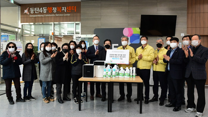 | ▲5일 동탄 4동 행정복지센터에서 열린 ‘친환경 살균수 제조기기’ 전달식 모습.(화성시 제공) |