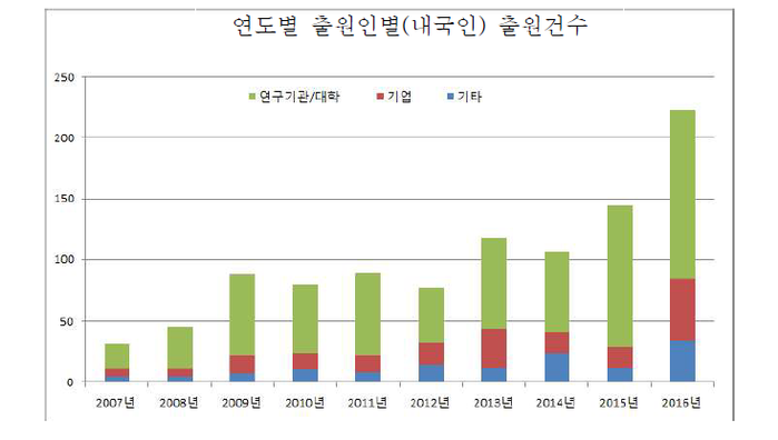 내국인 출원 중 연구기관·대학 출원이 67.9%, 기업 출원 19%, 기타 출원이 13%에 이른다. 국내 다출 원인은 연세대 산학협력단(83건), 한국생명공학연구원(81건), 국립암센터(44건) 등 순이다.