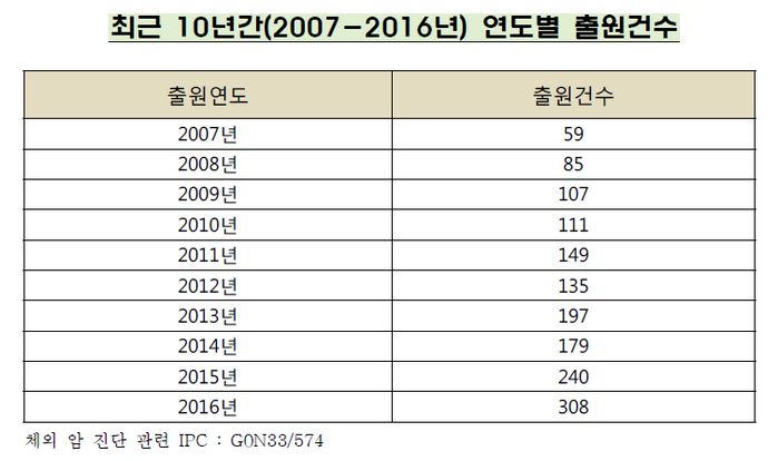 특허청에 따르면 2007년에 59건이던 혈액, 소변과 같은 체액에 포함된 바이오마커를 검출해 암을 진단하는 기술 출원이 지난해 308건에 이를 정도로 급격히 증가한 것으로 나타났다.