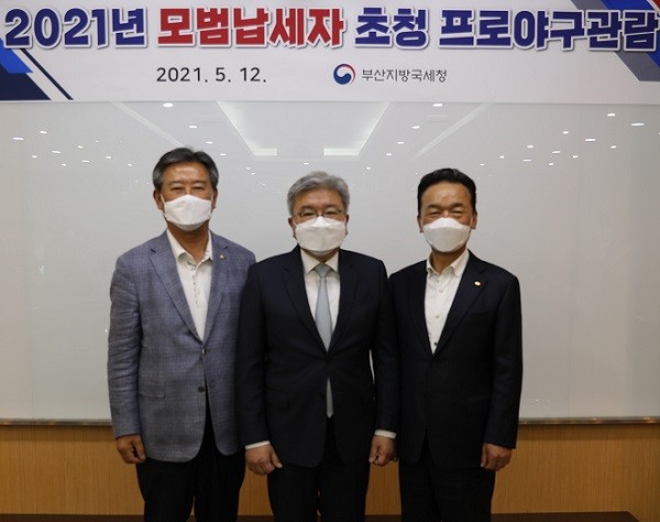 부산지방국세청은 지난 12일 부산 사직야구장에 모범납세자 정부포상을 수상한 기업 대표를 초청, 프로야구를 관람하면서 야구장을 찾은 시민을 대상으로 성실납세 홍보활동을 펼쳤다.