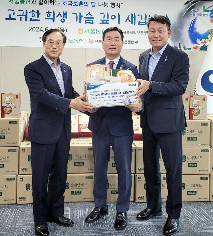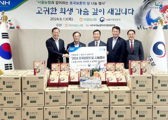 서울농협(본부장 김상수)은 13일, 호국보훈의 달을 맞아 (사)우리농업지키기운동본부 서울지역본부(본부장, 서울노조위원장 김성태), 서서울농협(조합장 조원민)과 함께 용산구 보훈가구를 위한 건강한 여름나기 삼계탕 300세트 및 농협상품 꾸러미 100세트 등 일천만원 상당의 물품 나눔 행사를 실시했다.