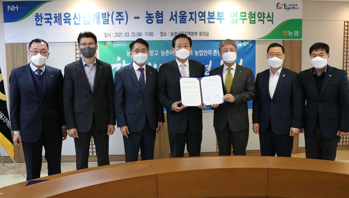 | ▲23일, 한국체육산업개발(주)(대표이사 김사엽)과 농협 서울지역본부(본부장 이대엽)는 농업·농촌 지원과 도농교류 활성화를 위한 업무협약을 체결했다.(왼쪽 3번째부터 이석용 농협 서울영업본부장, 김사엽 한국체육산업개발(주) 대표이사, 이대엽 농협 서울지역본부장)/서울농협 제공 |