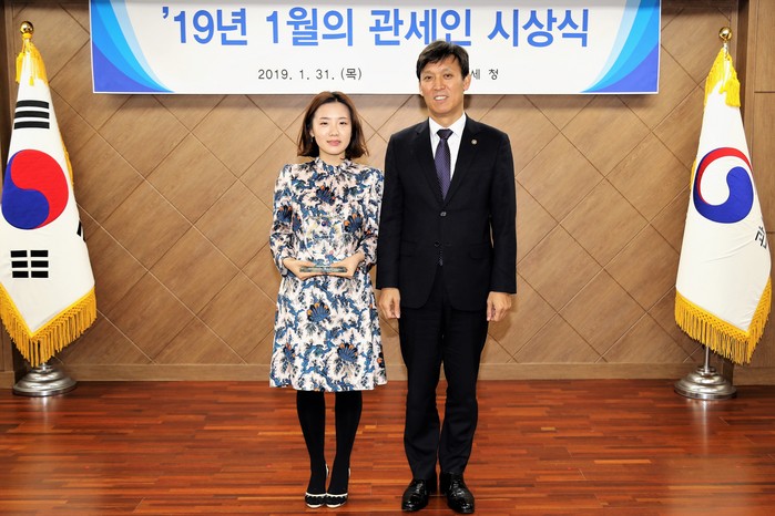 | ▲31일 ‘2019년 1월의 관세인’으로 선정된 이혜경 관세행정관(왼쪽)이 시상을 받으며 김영문 관세청장과 기념사진을 찍고 있다.(관세청 제공) |