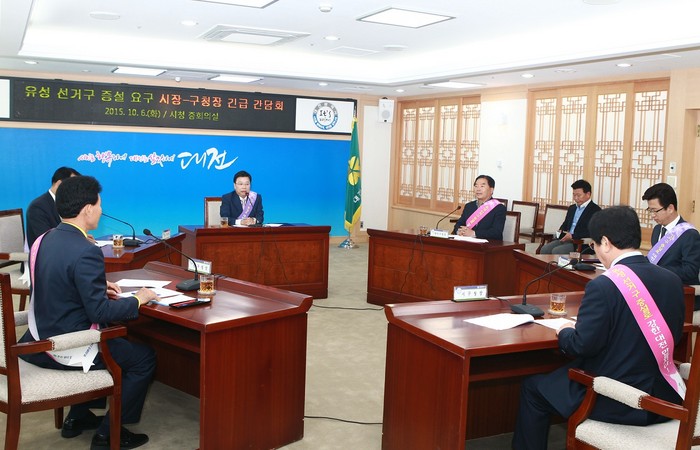 [로컬세계 오영균 기자] 국회의원 선거구 획정위원회(안) 제출 시한을 1주일 앞둔 6일 권선택 대전시장과 5개구청장은 유성 선거구 분리·증설와 긴급 결의문을 채택하고 강력히 촉구하는데 한 목소리를 냈다.