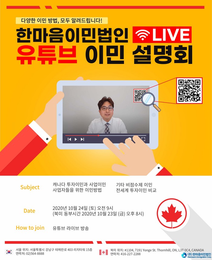 이번 설명회는 온라인 라이브 방송으로 실시간으로 진행한다. 한국 시간 기준으로 24일(토) 오전 9시(북미 시간 기준 23일(금) 오후 8시)에 시작한다. 전체 공개로 진행돼 별도의 참가 신청 없이 한마음이민법인 공식 유튜브를 통해 시청이 가능하다.