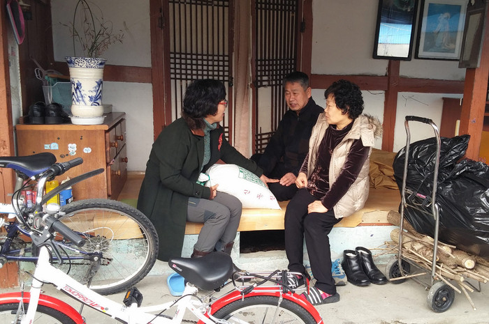 ▲익산 인화동 주민센터 관계자가 이춘수 통장이 기탁한 백미를 저소득층 가정에 전달하고 있다. 익산시 제공 |