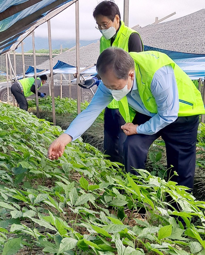 | ▲농협중앙회 이규삼 감사위원장과 사무처 임직원 20여명은 18일 강원도 신북농협 관내 인삼농가를 방문하여 농촌일손돕기를 실시했다. 농협 제공 |