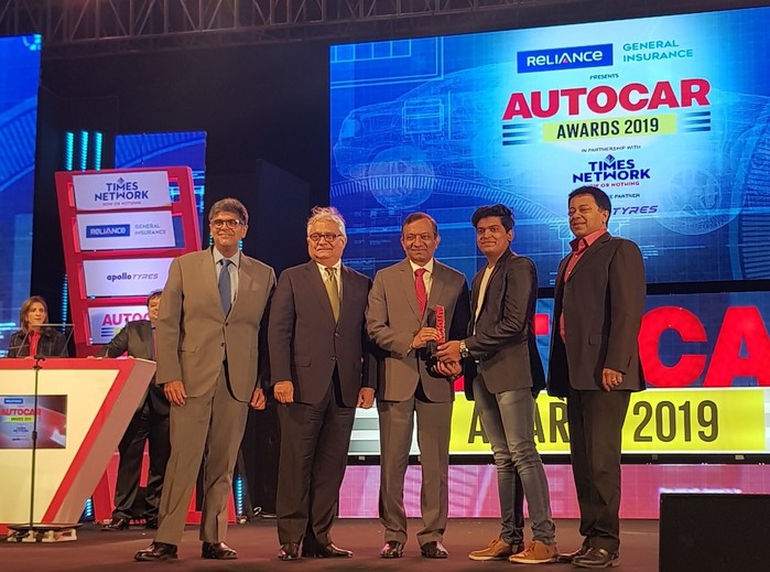 ▲지난 19일 인도 뭄바이에서 열린 2019 오토카 시상식에서 쌍용차의 G4 렉스턴이 ‘올해의 프리미엄 SUV’에 선정되면서 M&M 파완 고엔카 대표이사(가운데)가 상패를 전달받고 있다.(쌍용차 제공) |