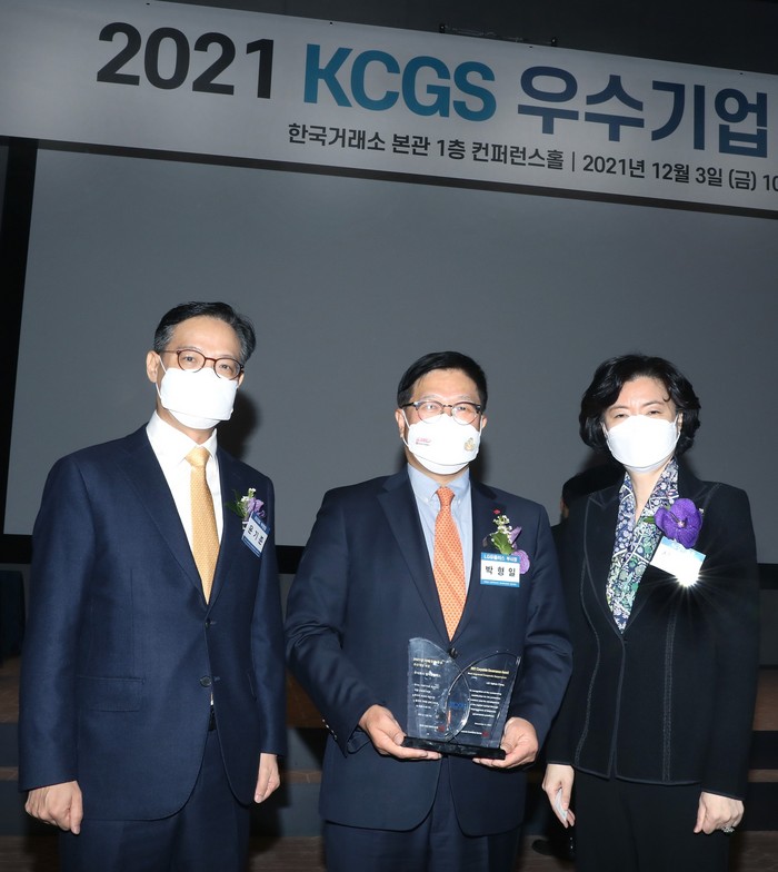 | ▲2021년 KCGS 우수기업 시상식'에서 지배구조 우수기업으로 선정된 LG유플러스 CRO 박형일 부사장(사진 가운데)이 수상 후 한국기업지배구조원 심인숙 원장(사진 오른쪽), 윤기준 한국기업지배구조원 부원장과 기념촬영하고 있다. |