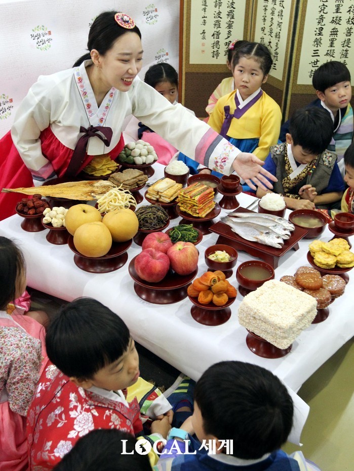 4일 서울 서초구 하나로마트 양재점에서 어린이들이 한복을 입은 직원과 함께 추석 차례상 차려보기를 체험 하고 있다. 농협유통은 어린이들에게 우리 땅에서 자란 농산물의 소중함을 알리면서 차례상에 들어가는 제수용품 및 과일·축산·수산 선물세트는 9월 12일까지 행사 카드로 결제 시 최대 42% 할인 판매한다.
