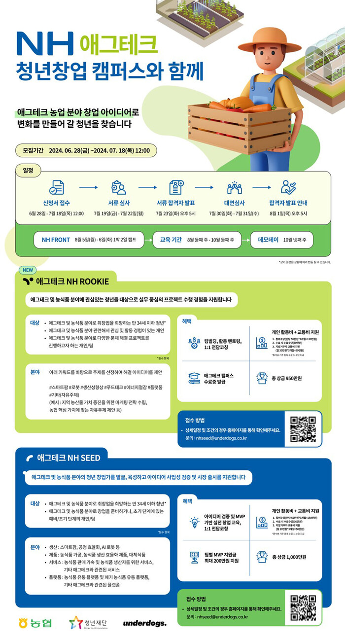 농협중앙회(회장 강호동)는 「애그테크 청년 창업캠퍼스」 프로그램 참가자를 모집한다고 8일 밝혔다. 이번 프로그램은 애그테크 및 농식품 분야 취창업을 희망하는 청년들을 대상으로 한다.