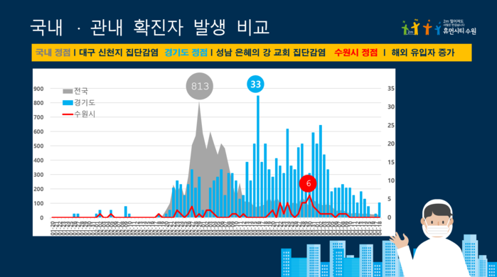 3월 8일에는 수원시에 첫 해외입국 확진자(수원 17번째 확진자)가 발생했다. 유럽 일원을 여행하고 돌아온 20대 남성이었다. 이튿날 확진자의 가족 1명이 감염돼 확진 판정을 받았다. 유럽을 다녀온 후 3월 23일 확진 판정을 받은 20대 남성의 가족은 이튿날 전원(3명)이 확진 판정을 받기도 했다.