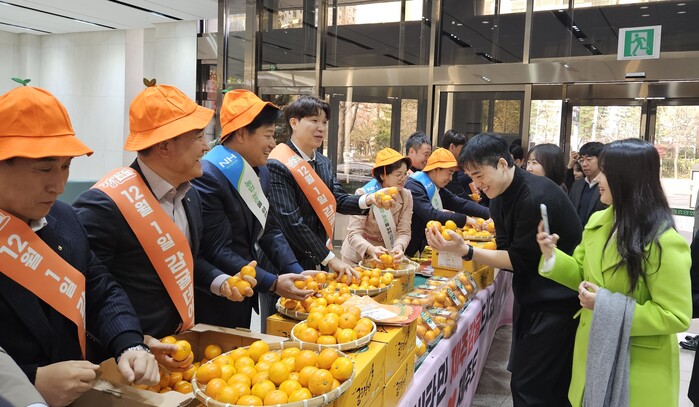 ▲ 29일, 서울농협과 제주농협이 함께 농협중앙회 서울본부 로비에서 임직원들을 대상으로 「고향사랑기부제 홍보 캠페인 및 제주감귤 나눔행사」를 실시했다. 서울농협 제공 |