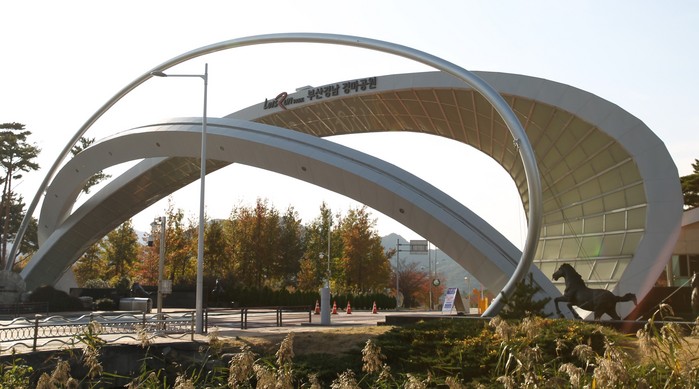 ▲부산 강서구 범방동과 경남 김해시에 걸쳐 있는 부산경남경마공원 정문 출입구 전경. 부산경남경마공원 제공 |