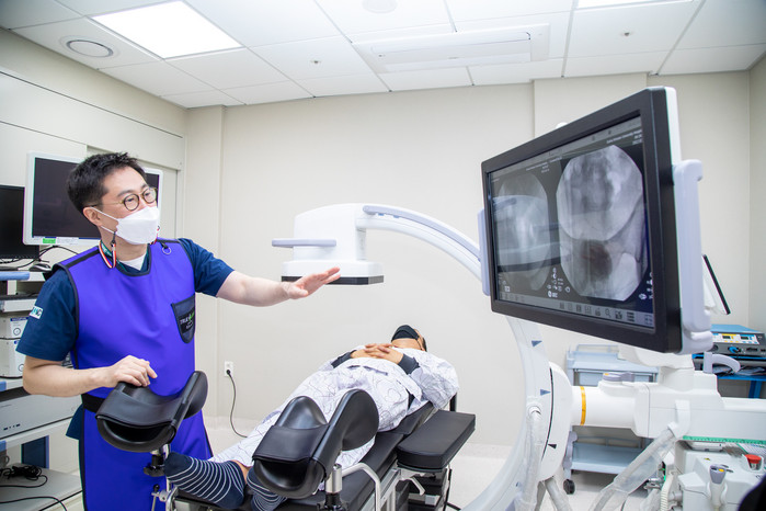 ▲이대비뇨기병원 신태영 교수가 국내 비뇨의학과 최초로 외래에 도입한 이동형 엑스레이 장비인 ‘씨-암(C-arm)’을 이용해 환자를 진료하고 있다. (이대비뇨기병원 제공) |
