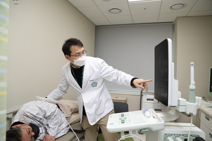 ▲이대비뇨기병원 김명수 교수가 최신형 초음파 장비로 환자를 진료하고 있다. (이대비뇨기병원 제공) |