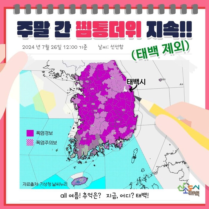 기상청 날씨누리에 따르면 7월 26일 12시 기준으로 태백시가 '열대야 없는 도시 태백!', 폭염특보 없는 유일한 도시로 등극했다.