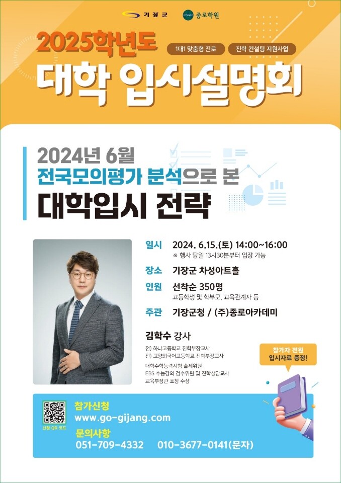 이번 설명회는 입시전문 교육기관인 종로아카데미와 연계해 기장군이 진행 중인 ‘1대1 맞춤형 진로·진학 컨설팅 지원사업’의 일환으로 진행된다.
