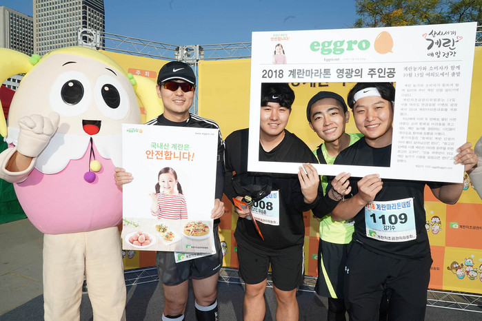 | ▲‘국산 계란 안전합니다’ 2018 계란마라톤대회 개최, 이번 대회는 어려움을 겪고 있는 국내 계란 농가와 시민들이 함께 달리며 계란의 안전성과 효능을 몸소 알리고, 어려운 이웃에게 계란을 기부한다는 취지로 열렸다.(계란자조금 제공) |