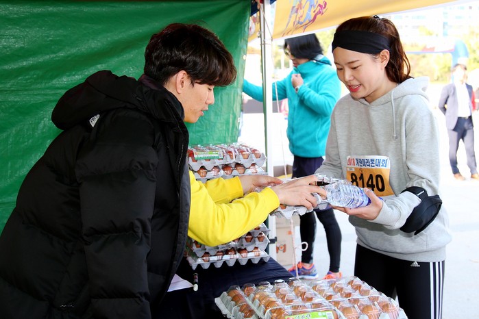 | ▲'완주하고 계란 한판', 계란 농가와 시민들이 함께 달리며 계란의 안전성을 알린다는 취지의 행사로, 참가자가 완주 후 계란을 받고 있다. |