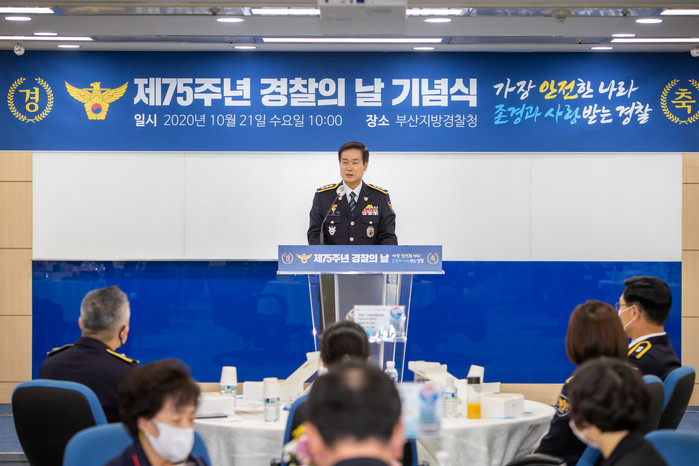 | ▲진정무 부산경찰청 청장이 21일 오전 경찰교육센터에서 열린 ‘제75주년 경찰의 날 기념식’에서 기념사를 하고 있다.(부산경찰청 제공) |