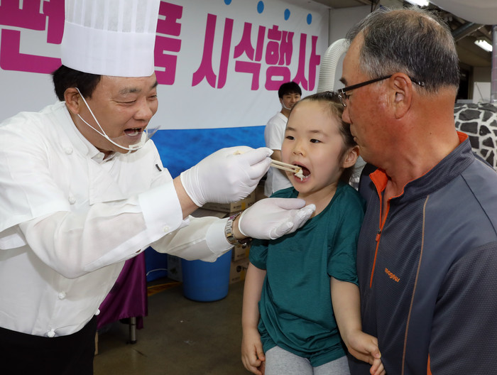 | ▲임준택 수협중앙회장(왼쪽에서 첫번째)이 21일(금) 수협강서공판장(서울특별시 강서구)에서 '수협이 만든 웰빙 밥상, 쿡하면 뚝딱 간편식품 시식행사'를 열고 행사를 찾은 소비자들에게 시식행사를 진행했다.(수협중앙회 제공) |