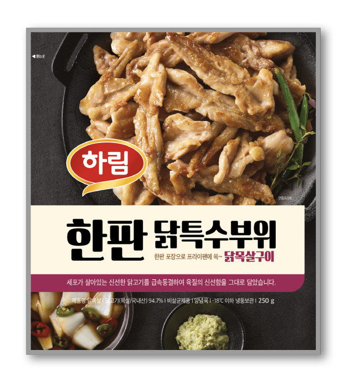닭목살은 닭 한 마리에서 한 점 남짓 나오는 귀한 특수부위로 기름기가 적당히 있어퍽퍽하지 않고 야들야들하다. ‘한판 닭특수부위 닭목살구이’는하림의 무항생제 인증을 받은 닭고기의 목살 부위만 모아 국내산 천일염으로 밑간한 제품으로 밥반찬은 물론 술안주로 제격이다. 품질 좋은 닭고기를 영하 35℃ 이하에서 40분간 개별 급속 동결하는 IFF(Individual FreshFrozen) 기법을 적용해 신선한 육질을 유지하고 잡내를 최대한 없앴다.
