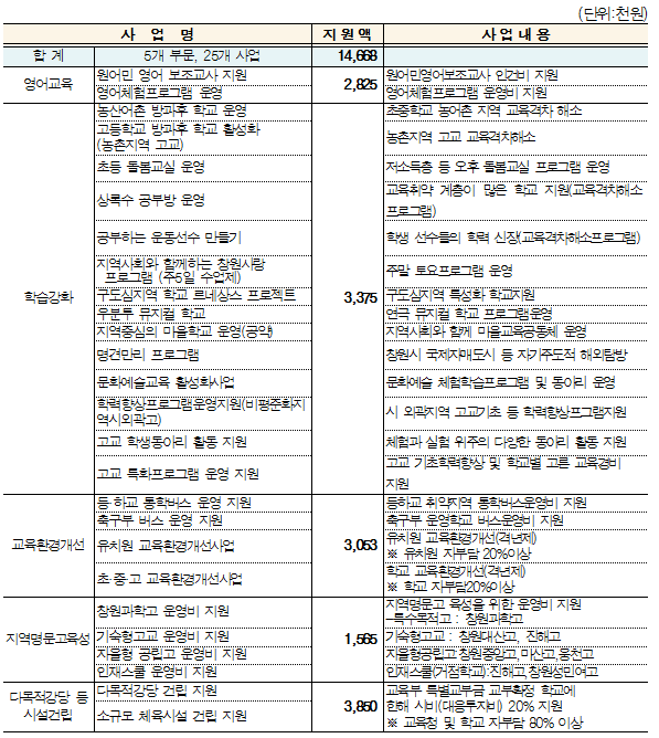 세부사업별 지원분야를 살펴보면 ▲영어교육지원사업 28억 2500만원 ▲지역중심의 마을학교 2억원 ▲초등돌봄교실 운영 2억원 ▲구도심지역르네상스 프로젝트 2억5천만원 ▲명견만리 프로그램 6천만원 ▲초·중·고농산어촌 방과후학교 운영 6억4500만원 ▲문화예술활성화 관련 지원사업 3억2700만원 ▲고교특화프로그램 및 동아리 활동 지원사업 9억800만원 등 학습강화지원사업에 총 33억7500만원이다.