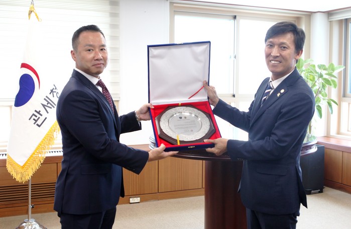 | ▲김영문 관세청장이 하워드슈Howard Shu DEA 한국지국장에게 감사패를 수여하고 있다. |