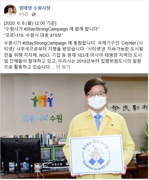 [로컬세계 고용주 기자]염태영 수원시장이 9일 코로나19 극복과 조기종식을 응원하는 ‘스테이 스트롱 캠페인’에 동참했다.