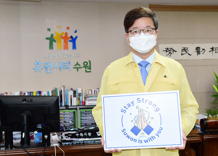 염태영 시장은 ‘Stay Strong, Suwon is with you’라는 문구가 적힌 손 팻말을 들고 캠페인에 참여했다. 손팻말에는 기도하는 두 손 위에 거품이 있는 그림이 있는데, 이는 개인위생을 철저하게 관리해 코로나19를 이겨내자는 의미다.