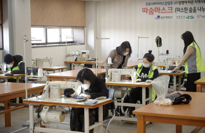 지난 16일 오산대학교에서 ‘재봉틀을 이용한 따숨마스크 제작 프로젝트’가 진행됐다. 오산시가 마스크 제작 키트를 제공하고 오산시자원봉사센터에서 재봉틀을 사용할 수 있는 시민봉사단을 모집, 오산대학교에서 교내 실습실과 재봉틀을 제공했다.