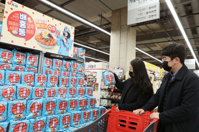 | ▲소비자들이 마트에서 '배홍동비빔면'을 고르고 있다. [농심 제공] |